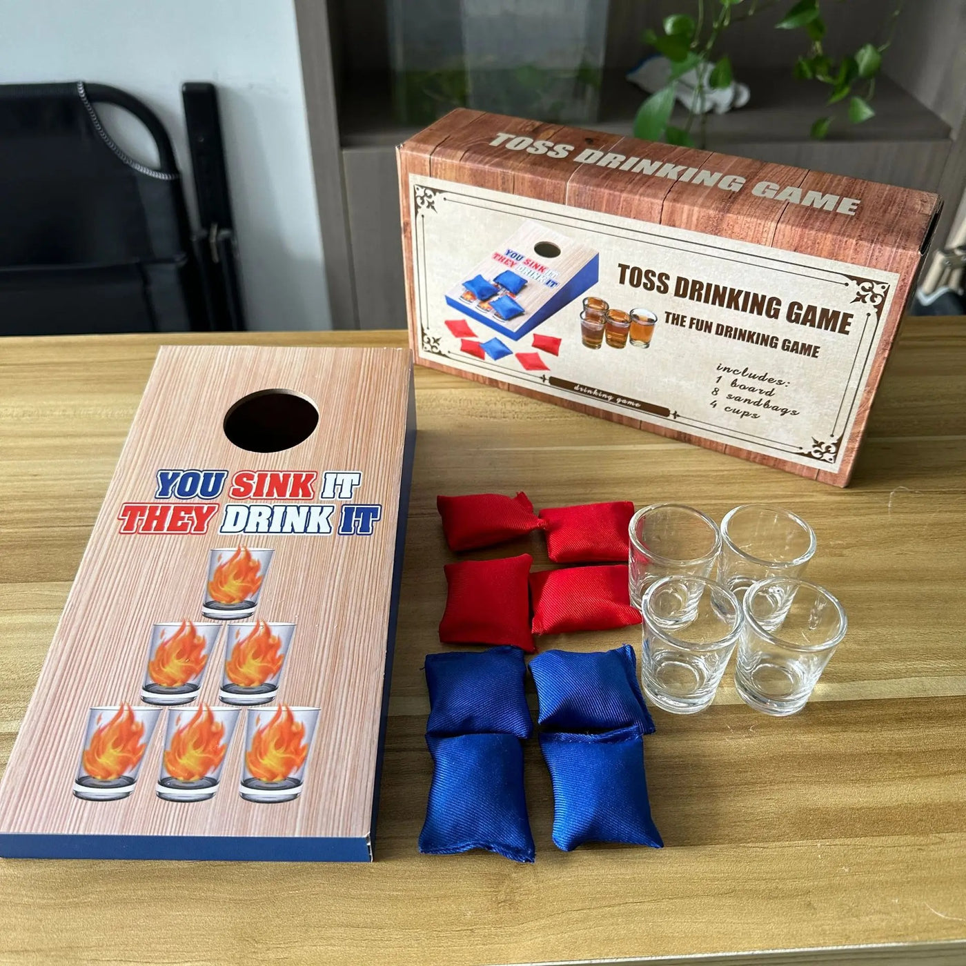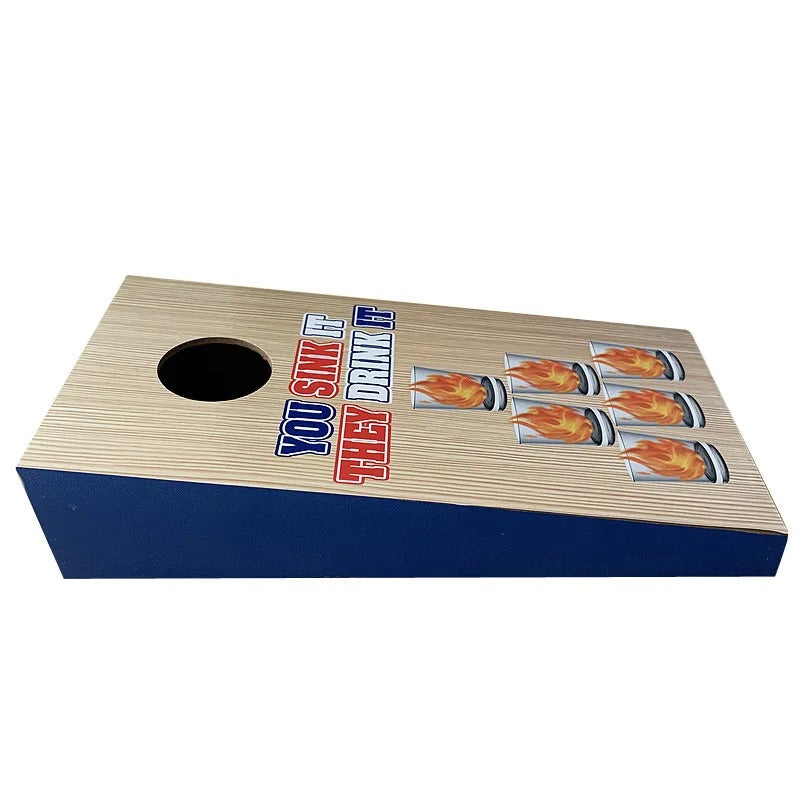 3. Players take turns tossing balls—sink a cup, and the opposite player takes a sip.